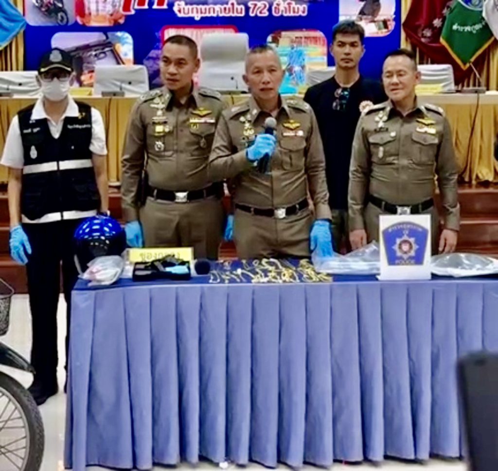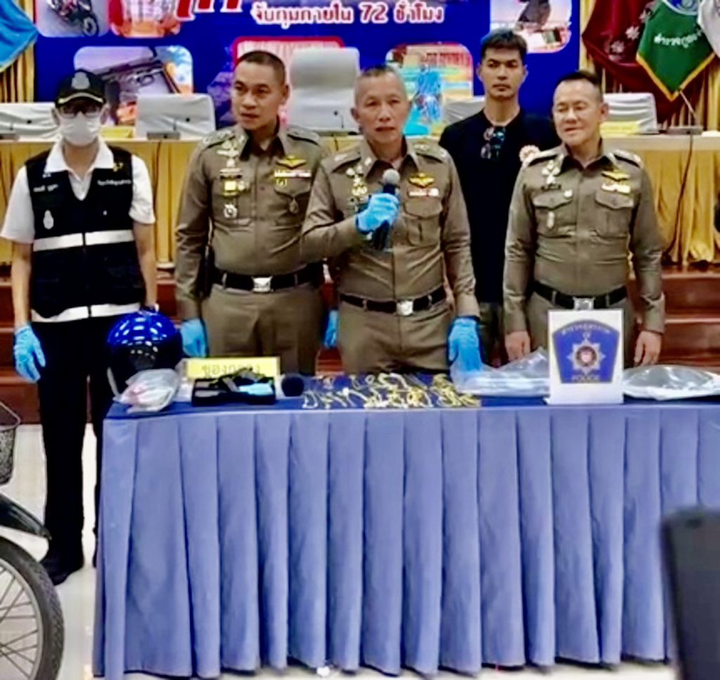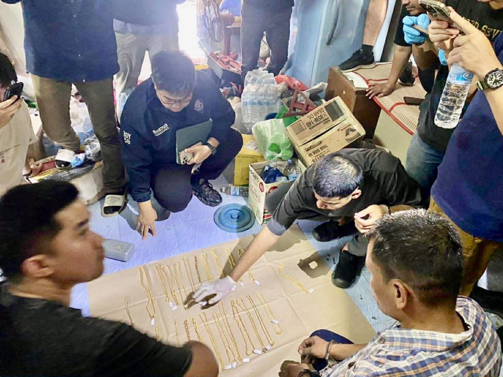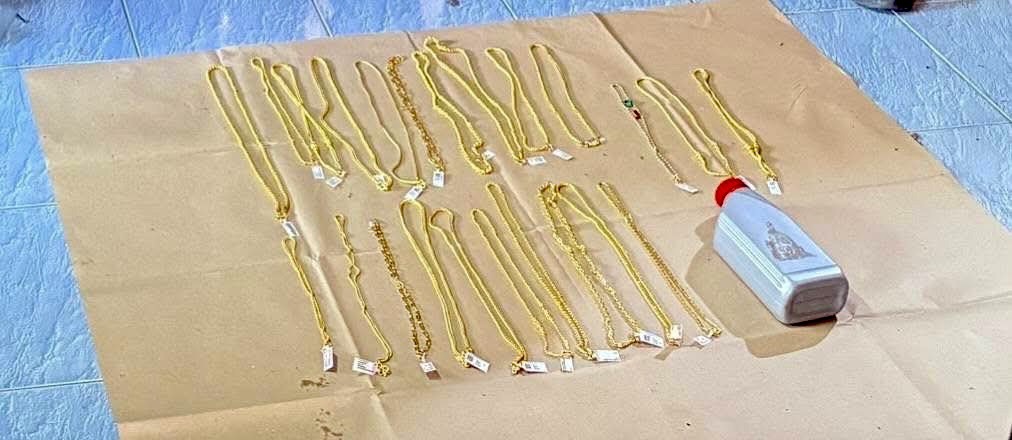 คดี อาวุธปืน แบลงค์กัน ยี่ห้อ โซรากิ ขนาด 9 มม. จำนวน 1 กระบอก พร้อมกล่องใส่อาวุธปืน หมวกกันน็อก แบบเต็มใบ สีน้ำเงิน จำนวน 1 ใบ รถจักรยานยนต์ ยี่ห้อ ยามาฮ่า รุ่น สปาร์ค สีดำ คันหมายเลขทะเบียน ขลน 428 ราชบุรี เสื้อผ้า-เครื่องแต่งกาย ที่ผู้ต้องหาใช้ในวันก่อเหตุ สร้อยคอทองคำรูปพรรณ น้ำหนัก 2 บาท จำนวน 23 เส้น มูลค่า 3,680,000 บาท โดยจับกุมตัวได้ที่บ้านพักต.หลักสาม อ.บ้านแพ้ว จ.สมุทรสาคร