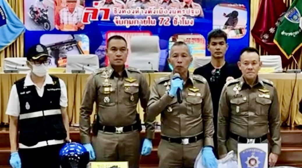พ.ต.อ.ธนบดี บุญพา นวท.(สบ4)กลุ่มงานตรวจสถานที่เกิดเหตุ ศพฐ.7 พ.ต.อ.ปิโยรส กัณหะสิริ ผกก.กก.สส.ภ.จว.นครปฐม พ.ต.อ.อชิรวัตติ์ ถาวรเจริญวัฒน์ผกก.สภ.เมืองนครปฐม พ.ต.ท.ตะวัน วัฒนรังสรรค์ รอง ผกก.ป.สภ.เมืองนครปฐม, พ.ต.ท.ฤทธิชัยปกรณ์ ดำรงค์อิทธิสกุล รอง ผกก. สส.สภ.เมืองนครปฐม,ชุดสืบสวน กก.สส.ภ.7 ชุดสืบสวนกก.สส.ภ.จว.นครปฐม ชุดสืบสวน สภ.เมืองนครปฐม ได้ร่วมแถลงผลการจับกุมผู้ต้องหาที่ก่อเหตุ ชิงทรัพย์ร้านทอง