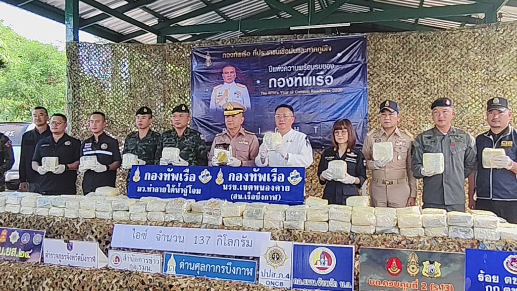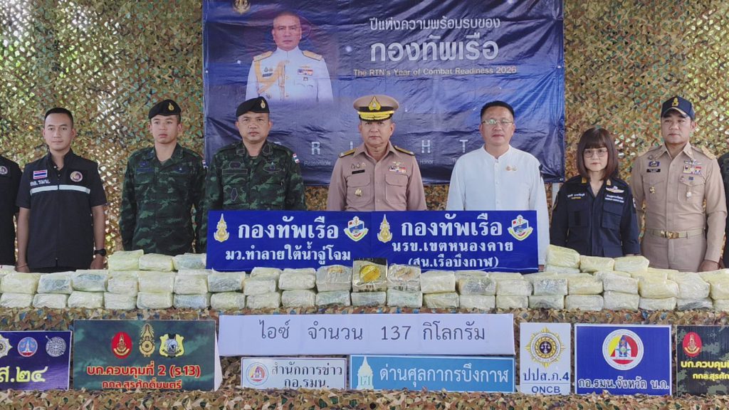 ที่ สถานีเรือบึงกาฬ อ.เมืองบึงกาฬ พลเรือตรี ณรงค์ เอมดี ผู้บัญชาการหน่วยเรือรักษาความสงบเรียบร้อยตามลำแม่น้ำโขง (ผบ.นรข.) พร้อมด้วยนายวรพันธ์ ชำนิยันต์ ปลัดจังหวัดบึงกาฬ และหน่วยงานที่เกี่ยวข้อง ร่วมแถลงข่าวการตรวจยยึดยาเสพติดให้โทษประเภท 1 (ไอซ์) จำนวน 137 ห่อ ห่อละประมาณ 1 กิโลกรัม มูลค่ารวมกว่า 137 ล้านบาท