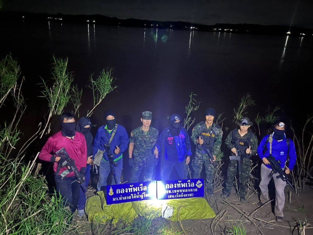 จึงได้ออกวางกำลังและปฏิบัติตามแผนที่วางไว้ จนกระทั่งวันที่ 5 พฤศจิกายน 2568 เวลาประมาณ 00.50 น. ชุดซุ่มเฝ้าตรวจบริเวณด้านใต้ป่าช้า บ.ห้วยดอกไม้ ได้ยินเสียงเครื่องยนต์เรือกีบเพลายาวลักษณะต้องสงสัยแล่นมาจากกลางลำแม่น้ำโขงแล่นตรงเข้ามายังป่าช้า บ.ห้วยดอกไม้ ต.โคกก่อง อ.เมืองบึงกาฬ และแล่นทวนน้ำโขงขึ้นไปด้านเหนือน้ำ เมื่อเห็นดังนั้นชุดซุ่มฯ จึงได้ออกจากจดซุ่มและเคลื่อนตัวติดตามเรือต้องสงสัยลำดังกล่าวไป