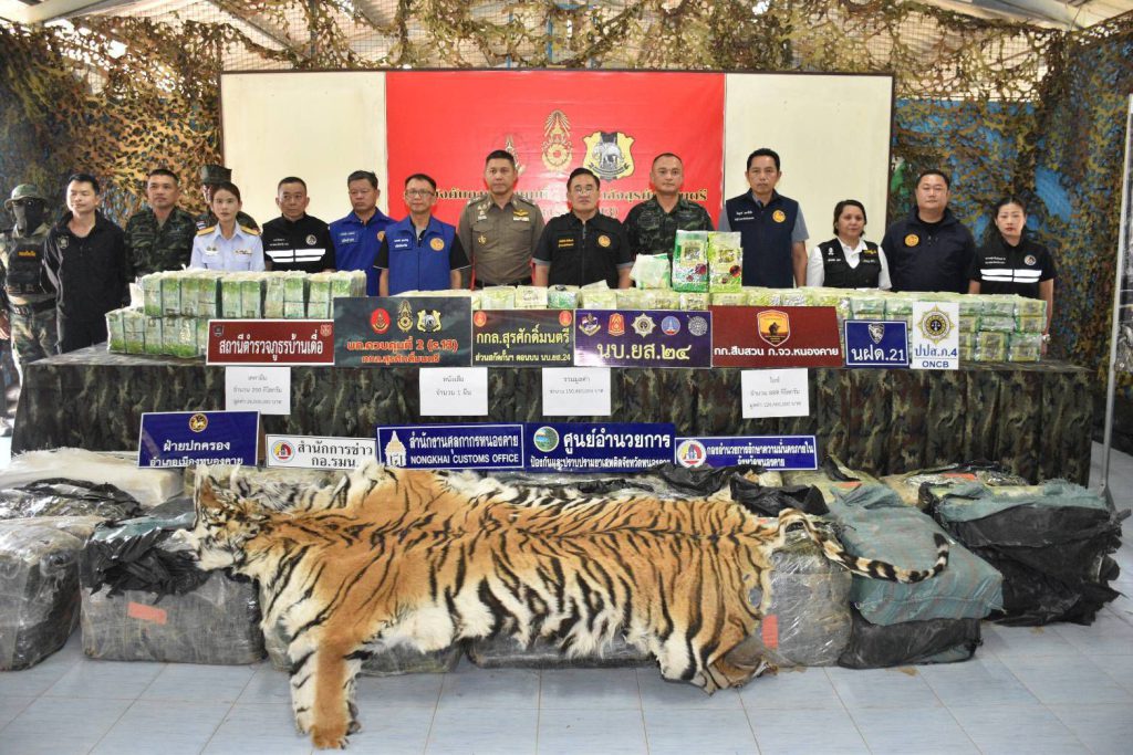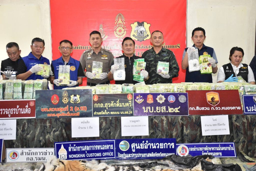 จึงแจ้งให้ชุดสกัดกั้น (หน่วยเฝ้าตรวจชายแดนที่ 21 ร่วมกับ กองกำกับการสืบสวน ตำรวจภูธรจังหวัดหนองคาย) ทำการสกัดกั้นตรวจสอบรถคันดังกล่าว และเมื่อเวลา 03.20 ณ ชุดสกัดกั้น ตรวจพบรถยนต์ต้องสงสัย บริเวณปากทางเข้าบ้านดงเวร ตำบลสีกาย อำเภอเมืองหนองคาย จังหวัดหนองคาย จึงได้ทำการขอตรวจค้นภายในรถ พบกระสอบ ข้างในบรรจุยาเสพติดประเภท 1 (ไอซ์) รวมทั้งสิ้นจำนวน 889 กก. (กระสอบสีดำ 20 กระสอบ กระสอบสีขาว 2 กระสอบ) เคตามีน 200 กก. บรรจุในกระสอบสีขาว จำนวน 5 กระสอบ ซากหนังเสือจำนวน 1 ผืน และรถยนต์ จำนวน 1 คัน และผู้ต้องหาที่เป็นคนขับรถ 1 ราย ทราบชื่อต่อมาคือนายคมสัน อายุ 28 ปี ภูมิลำเนาจังหวัดหนองคาย ตรวจยึดยาเสพติดทั้งหมดและควบคุมตัวผู้ต้องหามา ที่ฐานปฏิบัติการ หน่วยเฝ้าตรวจชายแดนที่ 21 บก.ควบคุมที่ 2 เพื่อสอบปากคำเบื้องต้นและทำบันทึกการจับกุม