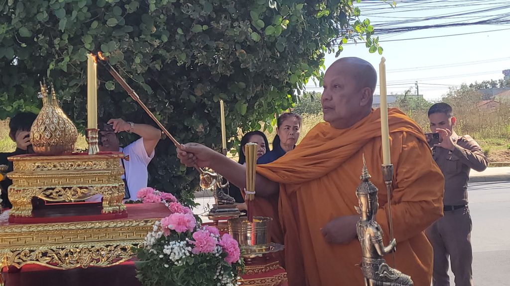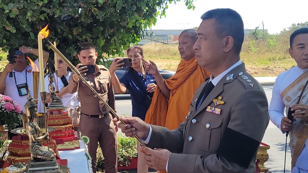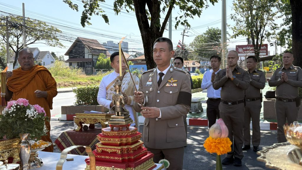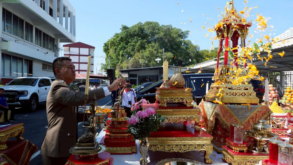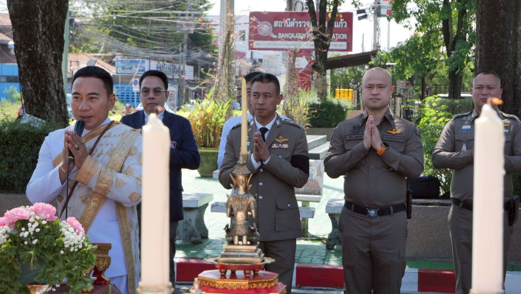 พระวชิรคณาทร ดร. เจ้าอาวาสวัดบางพลีใหญ่กลาง เป็นประธานประกอบพิธี พร้อมผู้บังคับบัญชา–ข้าราชการตำรวจและผู้นำท้องถิ่นเข้าร่วมอย่างพร้อมเพรียง