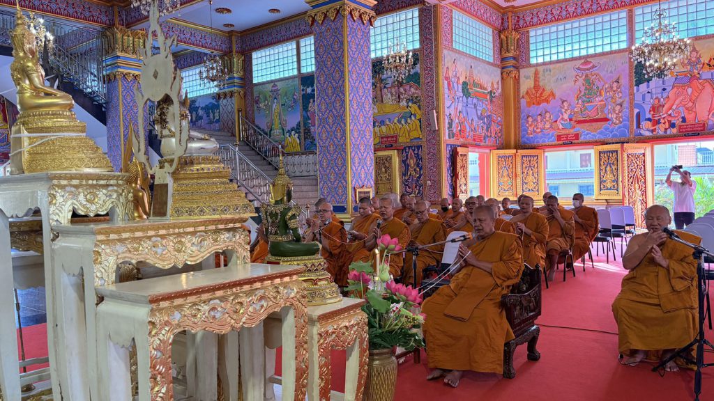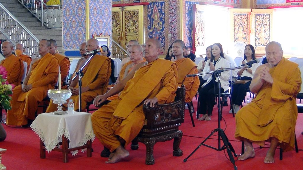 จากนั้น เป็นพิธีฉลองฉัตร คณะพระสงฆ์เจริญพระพุทธมนต์ สวดบท “ธรรมจักรกัปปวัตนสูตร” เพื่อความเป็นสิริมงคล