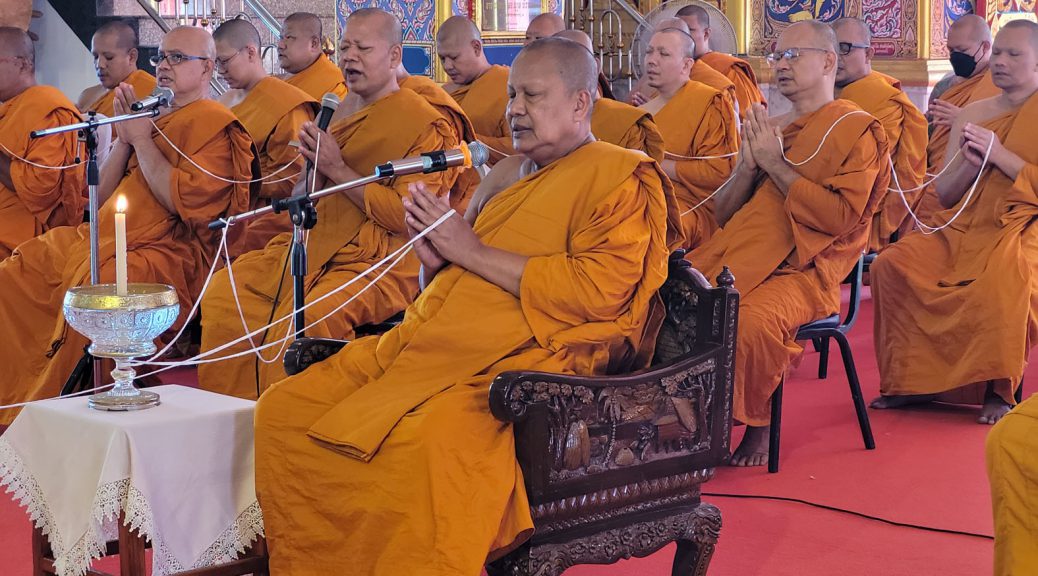 จากนั้น เป็นพิธีฉลองฉัตร คณะพระสงฆ์เจริญพระพุทธมนต์ สวดบท “ธรรมจักรกัปปวัตนสูตร” เพื่อความเป็นสิริมงคล