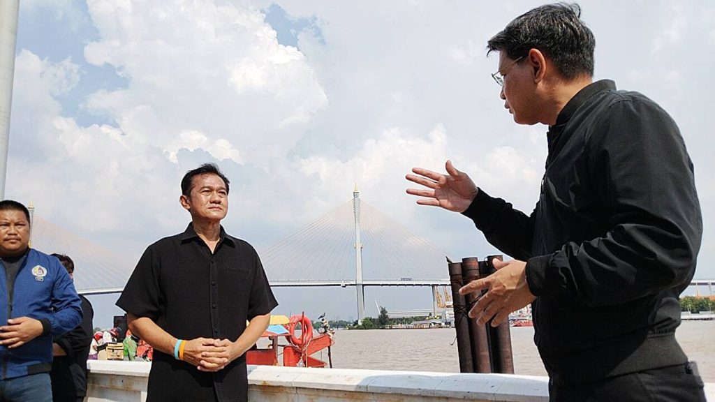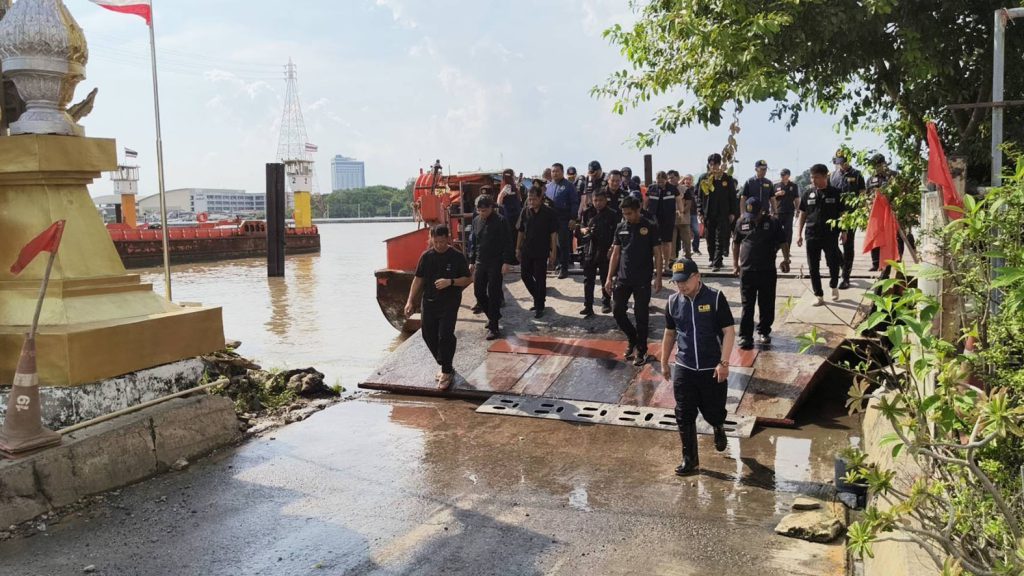 นายฉัตรชัย เวชสาร ผู้อำนวยการเจ้าท่าจังหวัดสมุทรปราการ / พ.อ.ธนิวรรธณ์ คำกรุนันทกานต์ รองผู้อำนวยการ กอ.รมน.จังหวัดสมุทรปราการ / และ พ.ต.อ.พยงค์ เอี่ยมสกุล ผกก.4 บก.รน.ตำรวจน้ำจังหวัดสมุทรปราการ ร่วมลงพื้นที่ตรวจสอบสถานการณ์น้ำบริเวณหน้าที่ว่าการอำเภอพระประแดง จังหวัดสมุทรปราการ พื้นที่ดังกล่าวเป็นจุดสำคัญของ