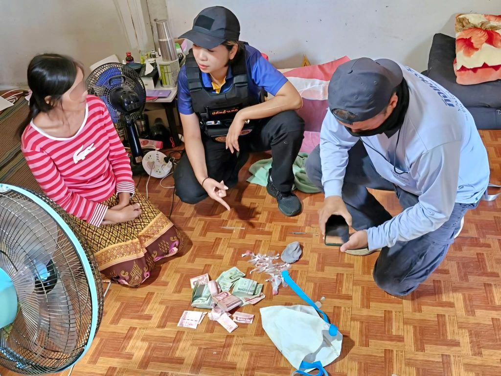 เมื่อถึงที่เกิดเหตุ เจ้าหน้าที่พบ นางสมเพียร พิมพ์เครื่อง อายุ 54 ปี อยู่ภายในบ้าน จึงแสดงตนก่อนทำการตรวจค้นอย่างโปร่งใส ผลการตรวจค้นพบ ยาบ้าหลายซองบรรจุในถุงพลาสติกซ่อนอยู่ในถุงเท้า ซึ่งถูกยัดไว้ในกระสอบเสื้อผ้าเก่าข้างตู้เสื้อผ้า และพบ เงินสดจากการจำหน่ายจำนวนนึง อยู่ในกระเป๋าสะพายสีขาวของผู้ต้องหา
