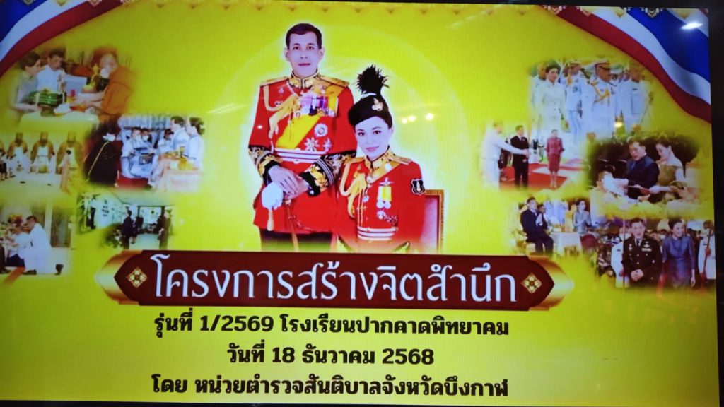 สารวัตรหัวหน้าหน่วยตำรวจสันติบาลบึงกาฬ พร้อมเจ้าหน้าที่ตำรวจในสังกัด ได้ร่วมกันจัดกิจกรรมอบรม “โครงการสร้างจิตสำนึกความจงรักภักดีต่อสถาบันพระมหากษัตริย์ และปลูกฝังความรักชาติ รุ่นที่ 1/2569” โดยมีนักเรียนชั้นมัธยมศึกษาตอนปลายจำนวน 100 คน เข้าร่วมอบรมอย่างพร้อมเพรียง