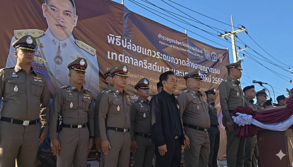 เมื่อเวลา 16.00 น. วันที่ 17 ธันวาคม 2568 ณ ลานสุขแสวง หน้าอาคารที่ทำการ ภ.จว.ประจวบคีรีขันธ์ พล.ต.ต.อาทร ชิ้นทอง ผบก.ภ.จว.ประจวบคีรีขันธ์ ได้เป็นประธานในพิธีปล่อยแถวระดมกวาดล้างอาชญากรรมครั้งใหญ่ เพื่อยกระดับความปลอดภัยและเตรียมความพร้อมรับมือช่วงเทศกาลคริสต์มาสและวันขึ้นปีใหม่ 2569