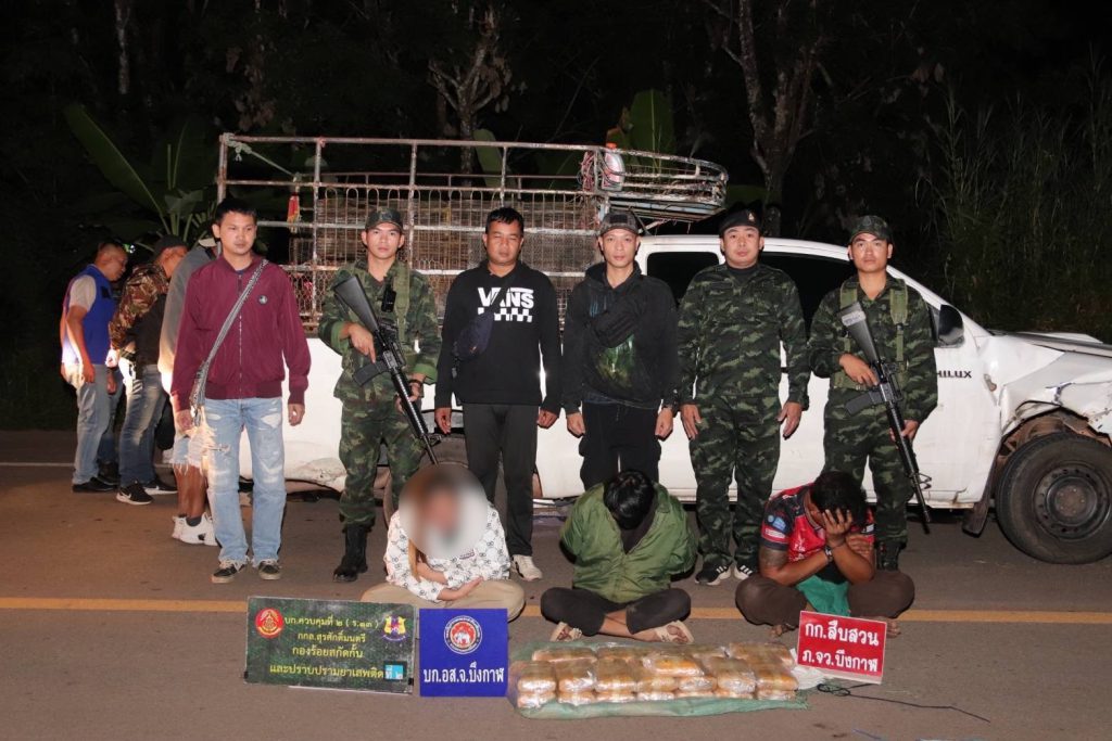 ร้อย.สกัดกั้นฯ ที่ 2 บก.ควบคุมที่ 2 (ร.13) กกล.สุรศักดิ์มนตรี และหน่วยงานความมั่นคงในพื้นที่ ได้รับแจ้งจากแหล่งข่าว ว่าจะมีการลักลอบลำเลียงยาเสพติดเข้ามาในพื้นที่ อ.เมืองบึงกาฬ จว.บ.ก. โดยใช้รถยนต์กระบะ ยี่ห้อ โตโยต้า สีขาว ทะเบียน ผท 1955 อุดรธานี ขับเข้ามาในพื้นที่ จนท.จึงจัดกำลัง ซุ่มเฝ้าตรวจ จนกระทั่ง เวลา 0230 จนท.ได้ตรวจพบรถยนต์คันดังกล่าว ตรงตามลักษณะที่แหล่งข่าวแจ้ง