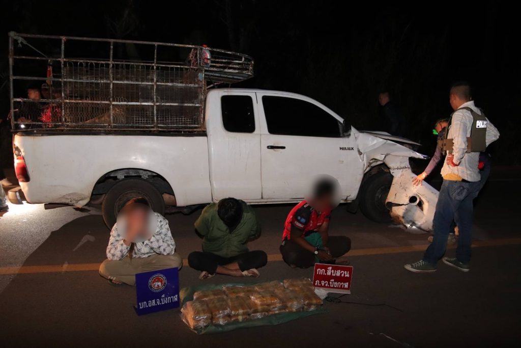 ขับมาตามเส้นทาง ถนนหมายเลข 3009 จนท.จึงได้ทำการไล่ติดตาม สกัดจับรถยนต์คันดังกล่าวไว้ได้ ที่บริเวณ ถนนหมายเลข 3009 บ.ดอนเสียด ต.บ้านต้อง อ.เซกา จว.บึงกาฬ หลังจากการตรวจค้นภายในรถยนต์ พบของกลางยาเสพติดให้โทษประเภท 1 (ยาบ้า) จำนวน 136,000 เม็ด จนท.จึงนำตัวผู้ต้องหาพร้อมของกลาง ส่ง กก.สืบสวน ภ.จว.บึงกาฬ เพื่อดำเนินการตรวจนับโดยละเอียด และดำเนินตามกฎหมายต่อไป เดวิท โชคชัย รายงาน