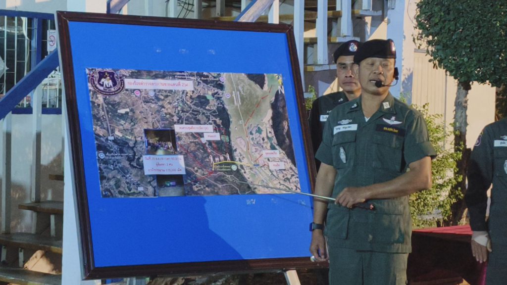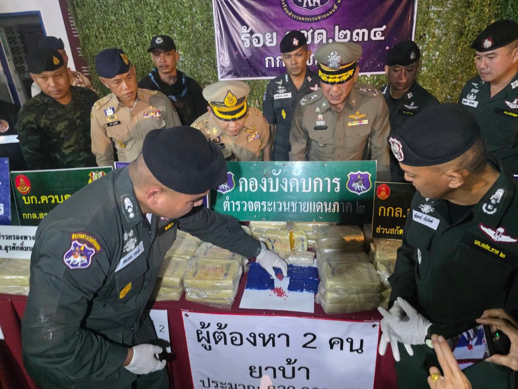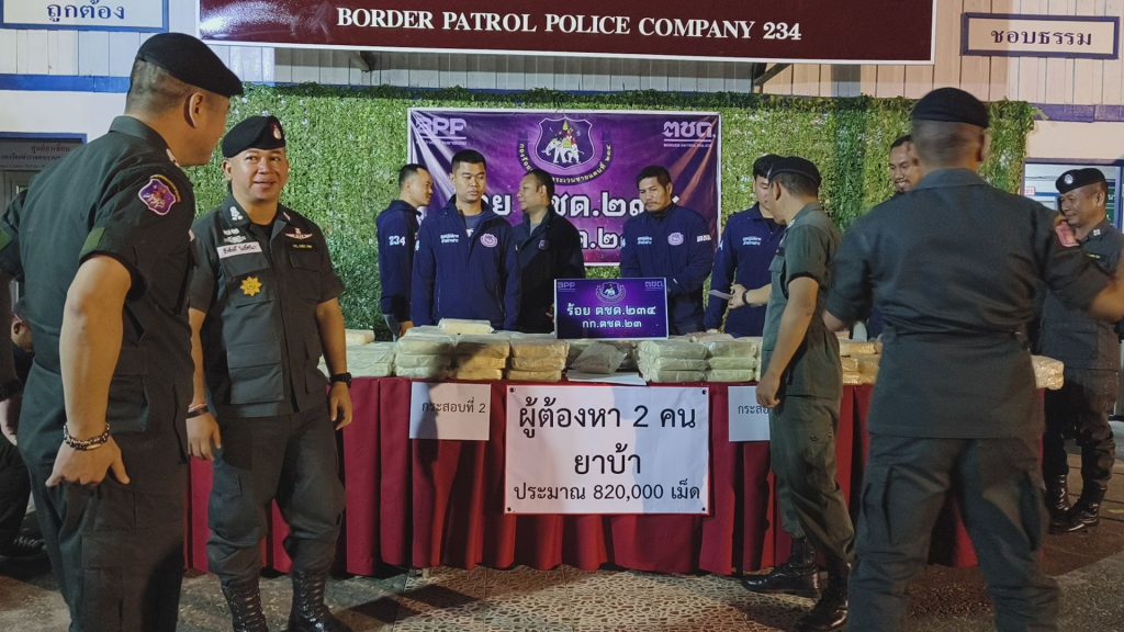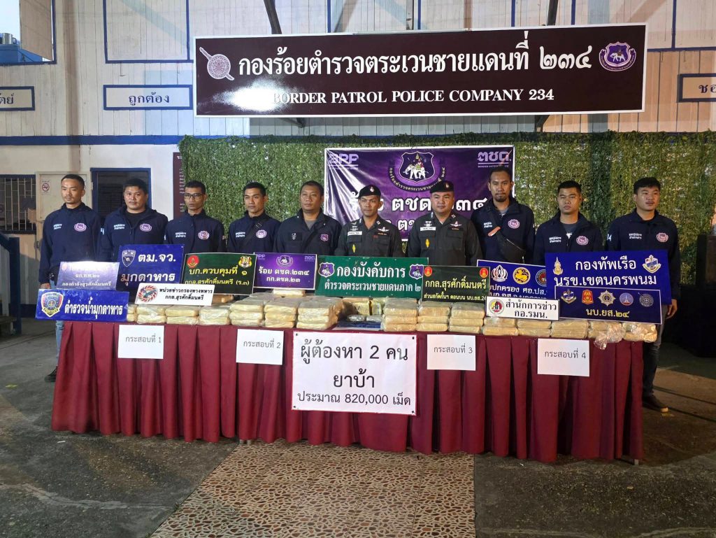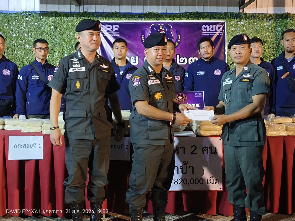 พ.ต.ท.บุญเลิศ วิเศษชาติ รองผู้กำกับการ ตชด.23 พ.ต.ท.ปรัชญลักษณ์ วิลาทัน รองผู้กำกับการหัวหน้ากองร้อย ตชด.234 และ พ.ต.ท.วัฒนพล ดาแก้ว ผู้บังคับกองร้อย ตชด.234 ร่วมแถลงผลการจับกุมขบวนการค้ายาเสพติดข้ามชาติ จับกุมผู้ต้องหาชาว สปป.ลาว 2 ราย พร้อมของกลางยาบ้าประมาณ 820,000 เม็ด