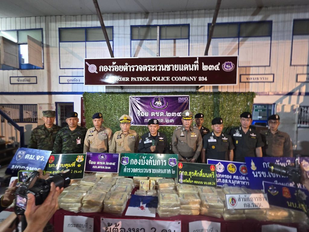 กระทั่งเวลา 00.30 น. วันที่ 20 มกราคม 2569 เจ้าหน้าที่พบกลุ่มบุคคลเดินแบกกระสอบต้องสงสัยเป็นขบวน จึงแสดงตัวเข้าตรวจสอบ ทำให้กลุ่มคนร้ายทิ้งกระสอบแล้ววิ่งหลบหนี เจ้าหน้าที่สามารถติดตามควบคุมตัวไว้ได้ 2 คน ทราบว่าเป็นชาวแขวงสาละวัน สปป.ลาว ส่วนผู้ร่วมขบวนการรายอื่นอาศัยความมืดและความชำนาญพื้นที่หลบหนีไปได้