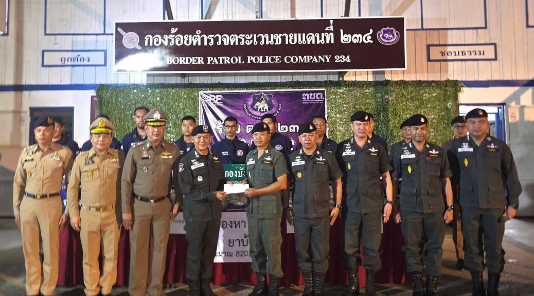 พ.ต.ท.บุญเลิศ วิเศษชาติ รองผู้กำกับการ ตชด.23 พ.ต.ท.ปรัชญลักษณ์ วิลาทัน รองผู้กำกับการหัวหน้ากองร้อย ตชด.234 และ พ.ต.ท.วัฒนพล ดาแก้ว ผู้บังคับกองร้อย ตชด.234 ร่วมแถลงผลการจับกุมขบวนการค้ายาเสพติดข้ามชาติ จับกุมผู้ต้องหาชาว สปป.ลาว 2 ราย พร้อมของกลางยาบ้าประมาณ 820,000 เม็ด
