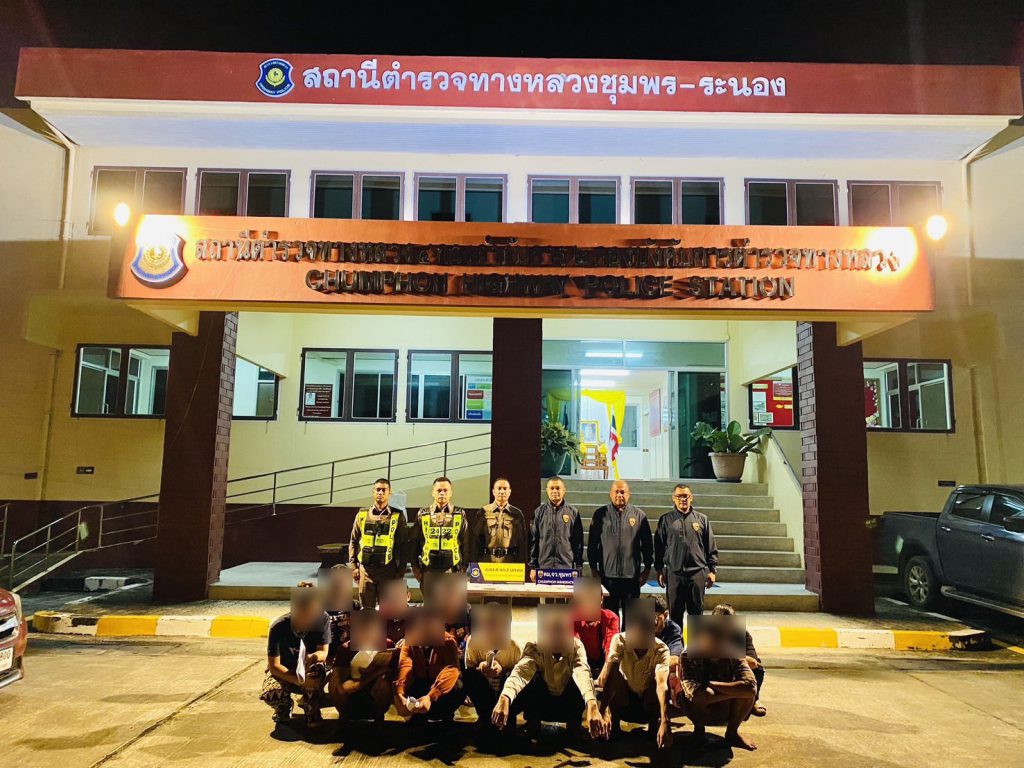 สถานที่จับกุม ริมถนน ทล.41 กม.482 ขาล่องใต้ ต.วังไผ่ อ.เมือง จ.ชุมพรร่วมกันจับกุม บุคคลต่างด้าวสัญชาติเมียนมา ชาย 10 คน หญิง 3 คน รวมทั้งหมด 13 คน ในข้อหา