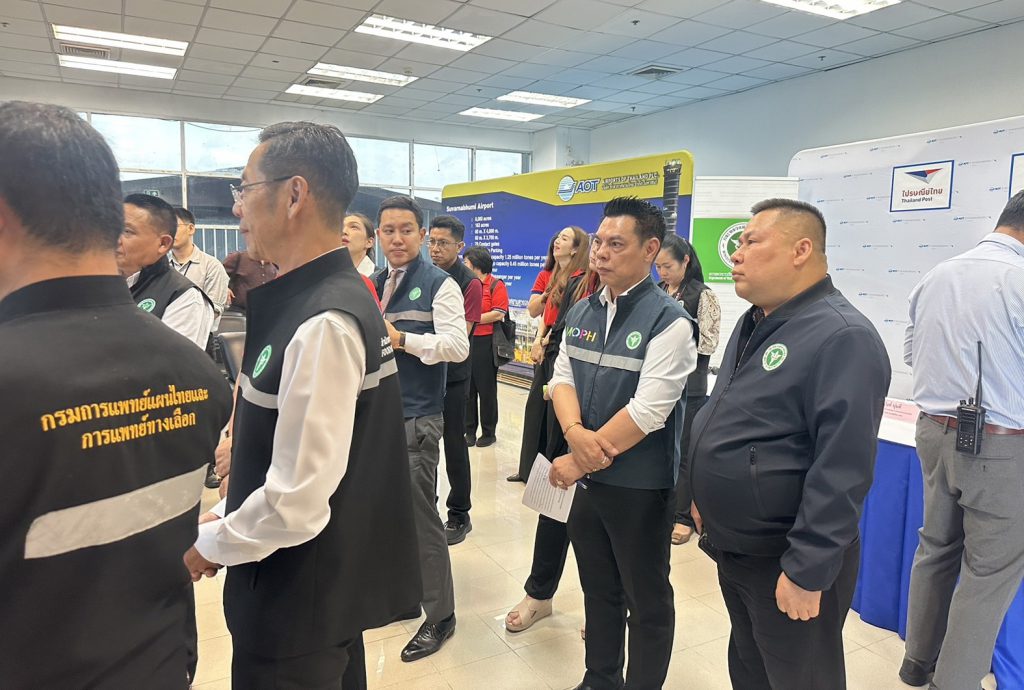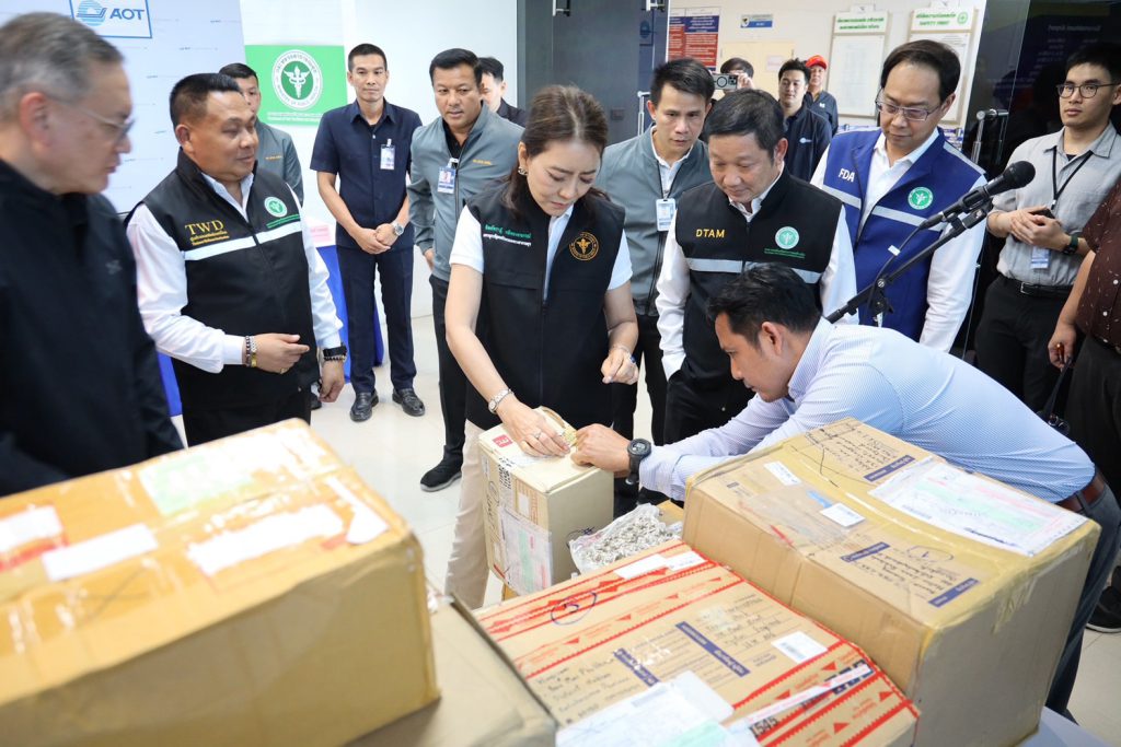ที่ศูนย์ไปรษณีย์ไทย ท่าอากาศยานสุวรรณภูมิ นางสาวจิตศ์ตราฎ์ หมีทองธนกรณ์ เลขานุการรัฐมนตรีว่าการกระทรวงสาธารณสุข และประธานคณะกรรมการปราบปรามการกระทำความผิดด้านกฎหมายของกระทรวงสาธารณสุข,