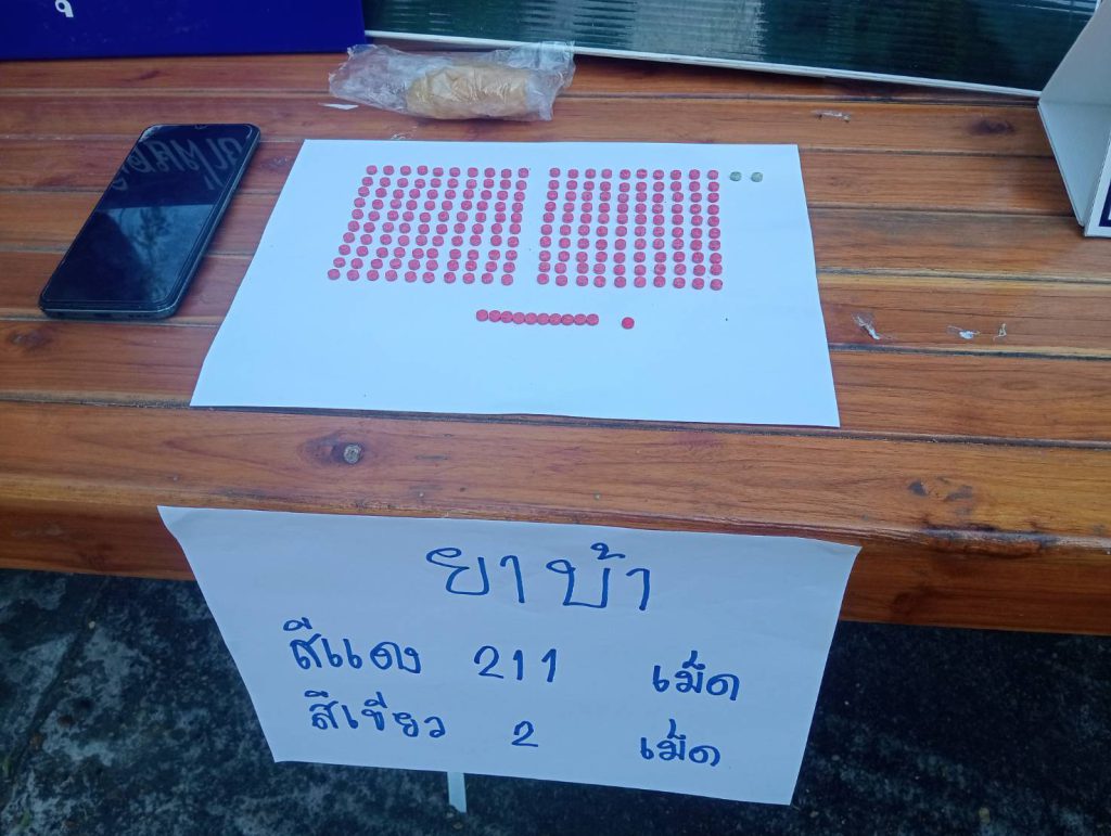 ผลการตรวจค้นพบวัตถุต้องสงสัยพันด้วยกระดาษไข หุ้มด้วยซองบุหรี่ ภายในเป็นยาบ้าบรรจุในถุงพลาสติกใส จำนวน 213 เม็ด แบ่งเป็นเม็ดสีแดง 211 เม็ด สีเขียว 2 เม็ด พร้อมยึดโทรศัพท์มือถืออีก 1 เครื่องเป็นของกลาง