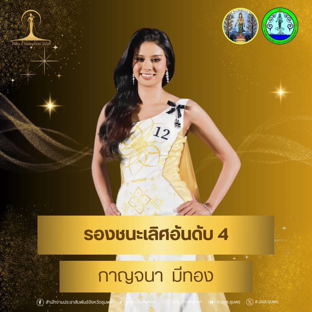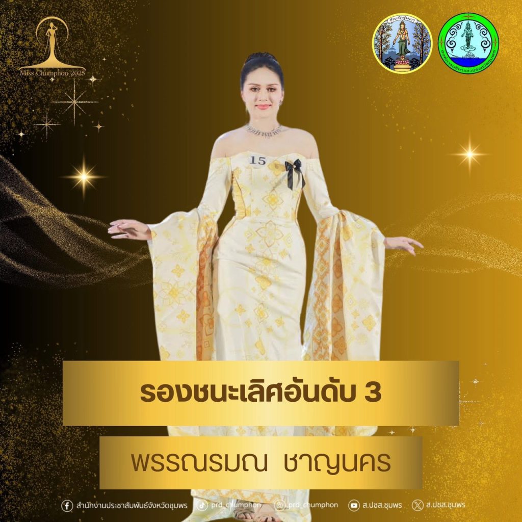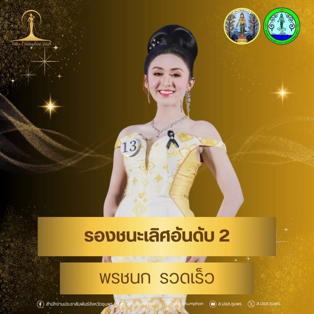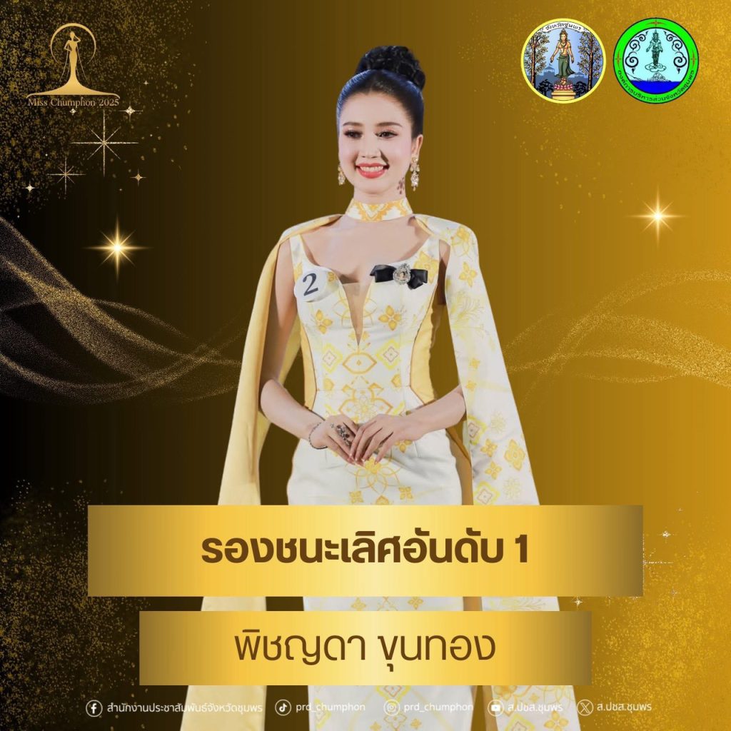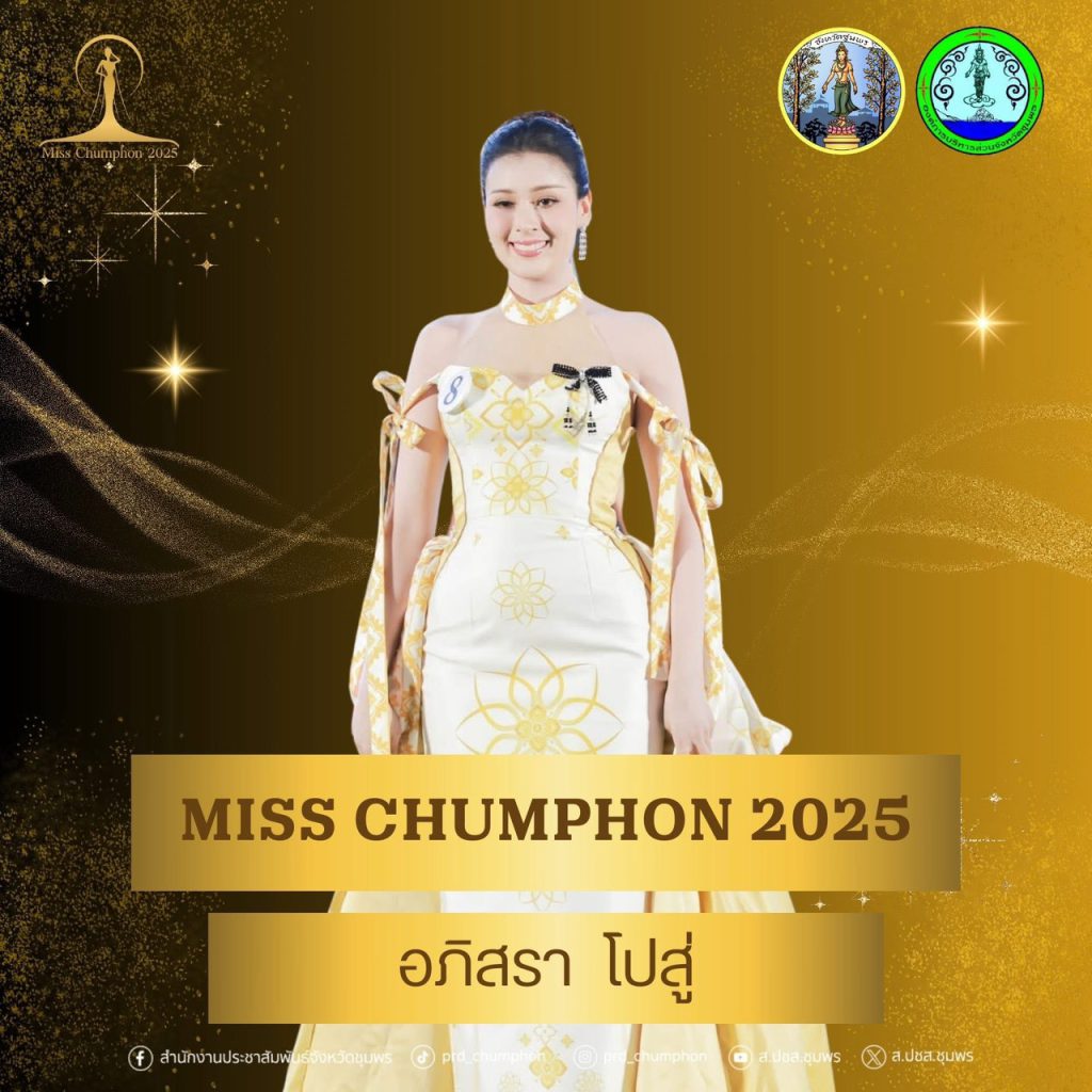 จังหวัดชุมพรขอแสดงความยินดีกับผู้เข้าประกวดทุกท่าน ที่ได้แสดงถึงความงาม ความสามารถ และศักยภาพอย่างโดดเด่น สร้างความภาคภูมิใจให้กับชาวชุมพรเป็นอย่างยิ่ง โดยผลการประกวด Miss Chumphon 2025 มีดังนี้ตำแหน่ง Miss Chumphon 2025“น้องโดนัท” อภิสรา โปสู่ ผู้เข้าประกวดหมายเลข 8ครองมงกุฎและสายสะพาย รับเงินรางวัล 30,000 บาท พร้อมคว้า รางวัลขวัญใจสื่อมวลชน