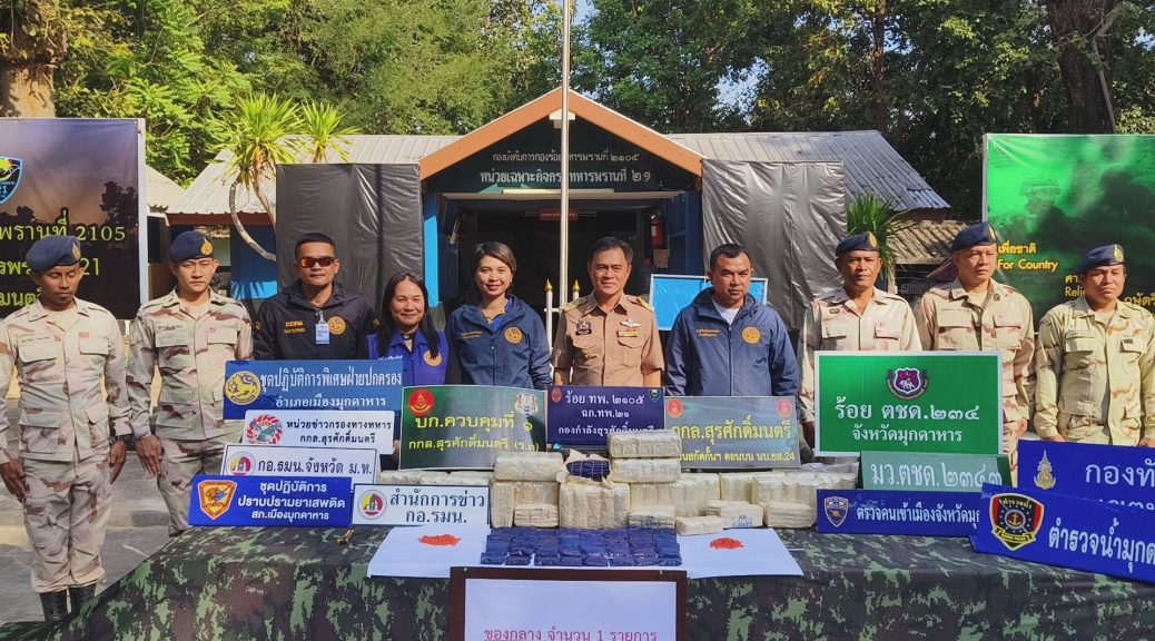 บังคับกองร้อยทหารพรานที่ 2105 (ผบ.ร้อย.ทพ.2105) และเจ้าหน้าที่จาก กอ.รมน., ตชด.234 ฝ่ายปกครองอำเภอเมืองมุกดาหาร ร่วมกันแถลงข่าวการตรวจยึดยาเสพติดให้โทษประเภท 1 (ยาบ้า) จำนวน 190,000 เม็ด
