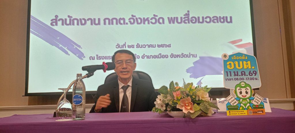 วันที่ 25 ธันวาคม 2568 เวลา 09.00 น. ที่ โรงแรมน่านตรึงใจ อำเภอเมืองน่าน จังหวัดน่าน นายบรรจง ขุนเพชร รองผู้ว่าราชการจังหวัดน่าน เป็นประธานเปิดกิจกรรม “สำนักงานคณะกรรมการการเลือกตั้งประจำจังหวัดน่าน พบสื่อมวลชน” เพื่อสร้างความร่วมมือในการประชาสัมพันธ์เน้นย้ำถึงความสำคัญของการใช้สิทธิเลือกตั้งตามเจตนารมณ์ของระบอบประชาธิปไตย และร่วมกันรณรงค์ส่งเสริมการใช้สิทธิเลือกตั้ง ทั้