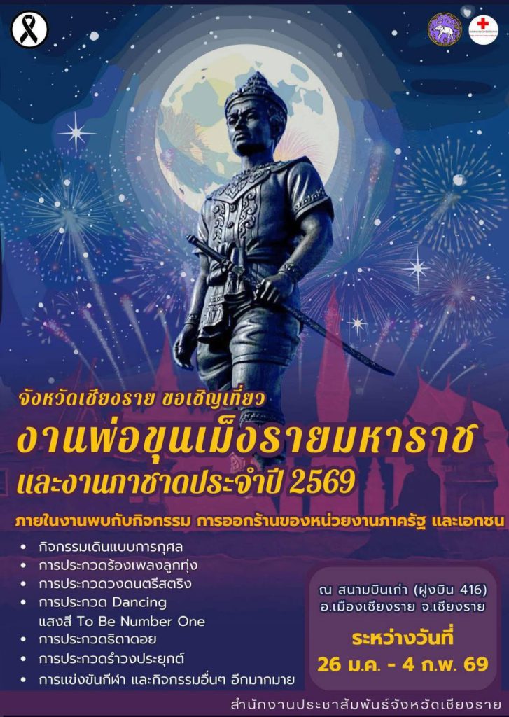วันที่ 26 มกราคม 2569 เป็นวันครบรอบการสถาปนาเมือง 764 ปีนายชูชีพ พงษ์ไชย ผู้ว่าราชการจังหวัดเชียงรายประกอบพิธีบวงสรวงพ่อขุนพญาเม็งรายมหาราชเวลา 09.00 น.เพื่อเป็นสิริมงคลเมืองเชียงรายก่อนที่จะมีพิธีไหว้สา”พญามังราย” พ่อขุนพ่อขุนเม็งรายมหาราช เจ้าผู้สร้างนครเชียงรายให้เจริญรุ่งเรืองสืบมาจนมาถึงปัจจุบันก่อนที่จะมีขบวนแห่เดินทางไปยังสนามบิน 416 สถานที่จัดงานพ่อขุนเม็งรายมหาราชและงานกาชาดจังหวัดเชียงรายประจำปี 2569 ระหว่างวันที่ 26 มกราคมถึงวันที่ 4 กุมภาพันธ์ 2569 สำหรับริ้วขบวนแห่ในภาคบ่าย สวยสดงามตระการตา จากอำเภอจาก 18 อำเภอ จะสิ้นสุดเวทีกลางและจะมีพิธีเปิดอย่างเป็นทางการ ในงานจะมีบูธส์การจัดแสดงอัตตลักษณ์ และของดีแต่ละอำเภอของจังหวัดเชียงรายอีกด้วยธนกฤต วรรมณี รายงาน