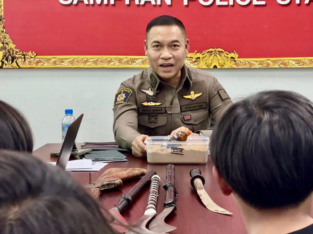 วันที่ 27 ม.ค.2569 เวลา 13.30 น. ที่ห้องประชุม สภ.สามพราน ต.สามพราน อ.สามพราน จ.นครปฐม พล.ต.ต.พิทักษ์ อุปพงษ์ ผบก.ภ.จว.นครปฐม พร้อมด้วย พ.ต.อ.ทรงวุฒิ เจริญวิชยเดช ผกก.สภ.สามพราน พ.ต.ท.สิทธิพร ไชยสิทธิ์ รอง ผกก.ป.สภ.สามพราน พ.ต.ท.ธนบดี รัชญ์พัฒน์ รอง ผกก. (สอบสวน) สภ.สามพราน พ.ต.ท.ชานนท์ ยางนอก รอง ผกก. (สอบสวน) สภ.สามพราน แถลงผลปฏิบัติการยุทธการพิทักษ์นครปฐม “สยบราชาย่านสามพราน ปราบอันธพาลนักเลงขาสั้น”