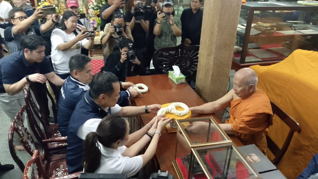 เมื่อมาถึงวัดกลางบางแก้ว ได้เข้าสักการะรูปหล่อจำลอง พระพุทธวิถีนายก (หลวงปู่บุญ)และหลวงปู่เพิ่ม อดีตเจ้าอาวาสวัดกลางบางแก้ว เข้าชมพระเครื่องพระบูชาในพิพิธภัณฑ์พระพุทธวิถีนาย และเข้ากราบนมัสการพระครูธรรมธรพีระ อภิวฑฺฒโน เจ้าอาวาสวัดกลางบางแก้ว จากนั้นได้พบกับ ผู้สมัคร สส.จังหวัดนครปฐม ของพรรคภูมิใจไทย ทั้ง 6 เขต และพบประชาชนที่มาต้อนรับจำนวนมาก ซึ่งมาขอถ่ายรูปกับนายกและนายกฯ