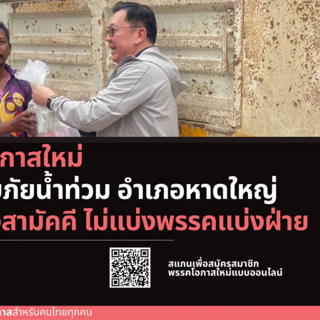วันที่ 29 พฤศจิกายน 2568 จตุพร บุรุษพัฒน์ หัวหน้าพรรคโอกาสใหม่ และคณะกรรมการบริหารพรรคได้ลงพื้นที่สำรวจสถานการณ์น้ำท่วมในอำเภอหาดใหญ่ โดยเฉพาะเขตที่ได้รับผลกระทบอย่างรุนแรง พร้อมนำข้าวสารและอาหารแห้งจำนวน สองคันรถหกล้อ ได้ที่ฝากประสานมาจากหลากหลายภาคเพื่อแจกจ่ายและบรรเทาความเดือดร้อนให้แก่พี่น้องประชาชนที่ประสบอุทกภัย