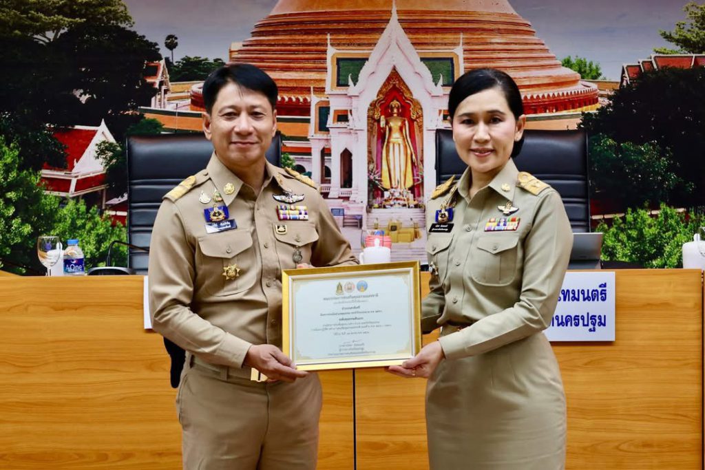 ให้กับ นายนรวีร์ ขันธหิรัญ นายอำเภอนครชัยศรี รับมอบเกียรติบัตร อำเภอคุณธรรมต้นแบบ ประจำปีงบประมาณ พ.ศ.2568 ทั้งนี้ นางฐิติรัตน์ เรืองสังข์ วัฒนธรรมจังหวัดนครปฐม