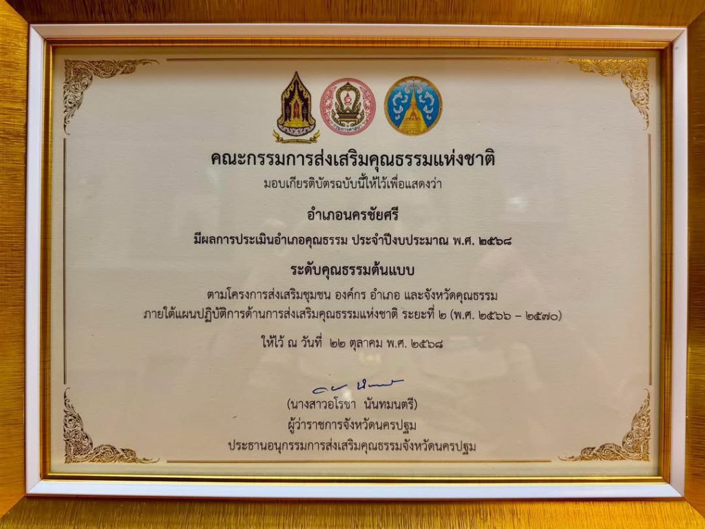สำหรับการมอบเกียรติบัตรยกย่องอำเภอคุณธรรม ระดับคุณธรรมต้นแบบ ประจำปี งบประมาณ พ.ศ. 2568 จำนวน 7 อำเภอได้แก่ อำเภอนครชัยศรี ซึ่งในปีนี้ได้รับคัดเลือกเป็นอำเภอคุณธรรมต้นแบบโดดเด่น