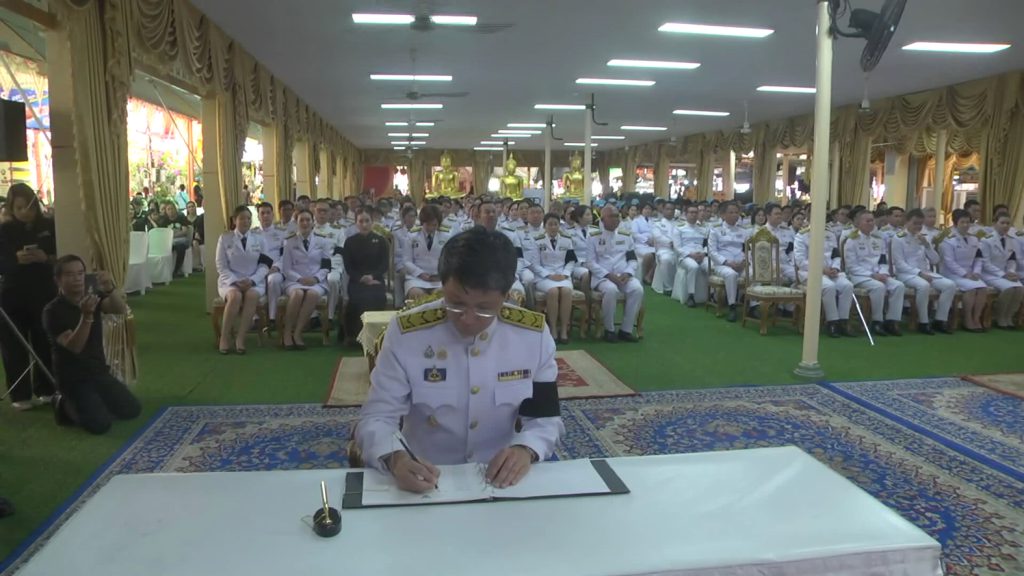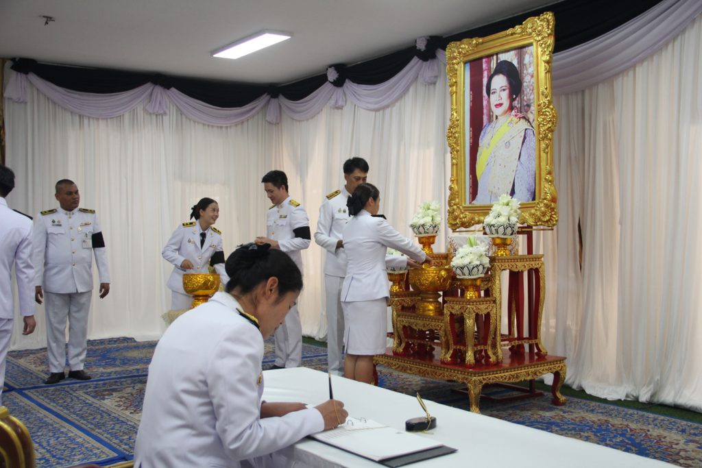 นายสยาม ศิริมงคล ผู้ว่าราชการจังหวัดสมุทรปราการ พร้อมด้วยนางอรจิรา ศิริมงคล นายกเหล่ากาชาดจังหวัดสมุทรปราการ ข้าราชการจากหน่วยงานต่างๆ และพสกนิกรทุกหมู่เหล่าในจังหวัดสมุทรปราการ ถวายน้ำสรงพระบรมศพ และลงนามถวายความอาลัย