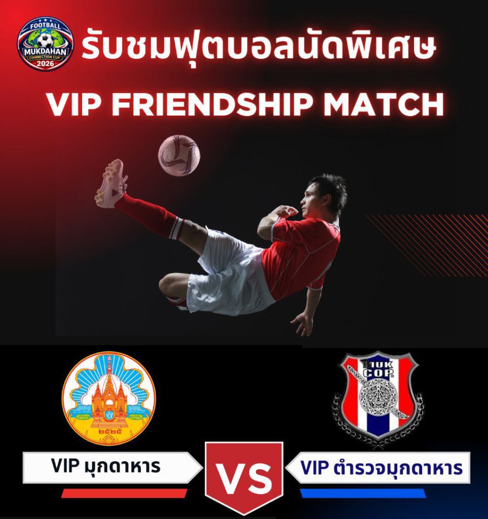 รายการ “Mukdahaก Connection Cup 2026” ในวันพุธที่ 11 กุมภาพันธ์ 2569 เวลา 16.30 น. ณ สนามฟุตบอลหญ้าเทียม Smile Soccer อำเภอเมืองมุกดาหาร จังหวัดมุกดาหาร