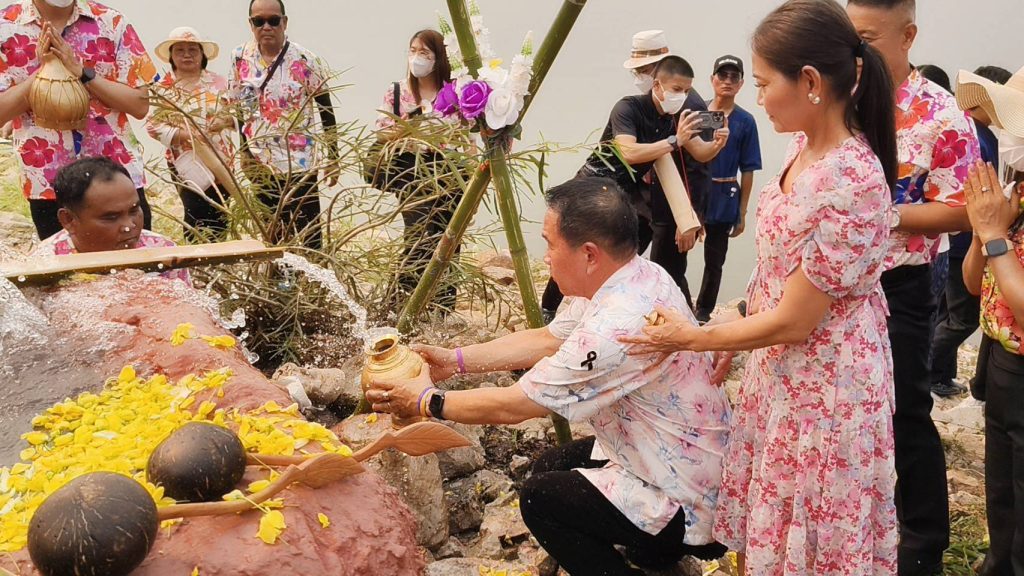 นำหัวหน้าส่วนราชการ องค์กรปกครองส่วนท้องถิ่น ฝ่ายปกครอง และพุทธศาสนิกชนชาวจังหวัดบึงกาฬ ร่วมพิธีบวงสรวงและแห่น้ำจั้นศักดิ์สิทธิ์ บริเวณริมแม่น้ำโขง บ้านท่าไคร้ ตำบลบึงกาฬ อำเภอเมืองบึงกาฬ จังหวัดบึงกาฬ