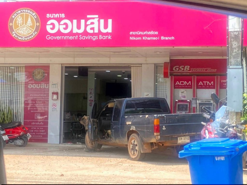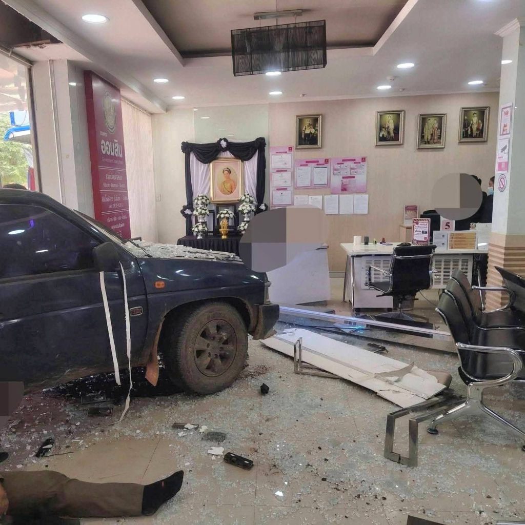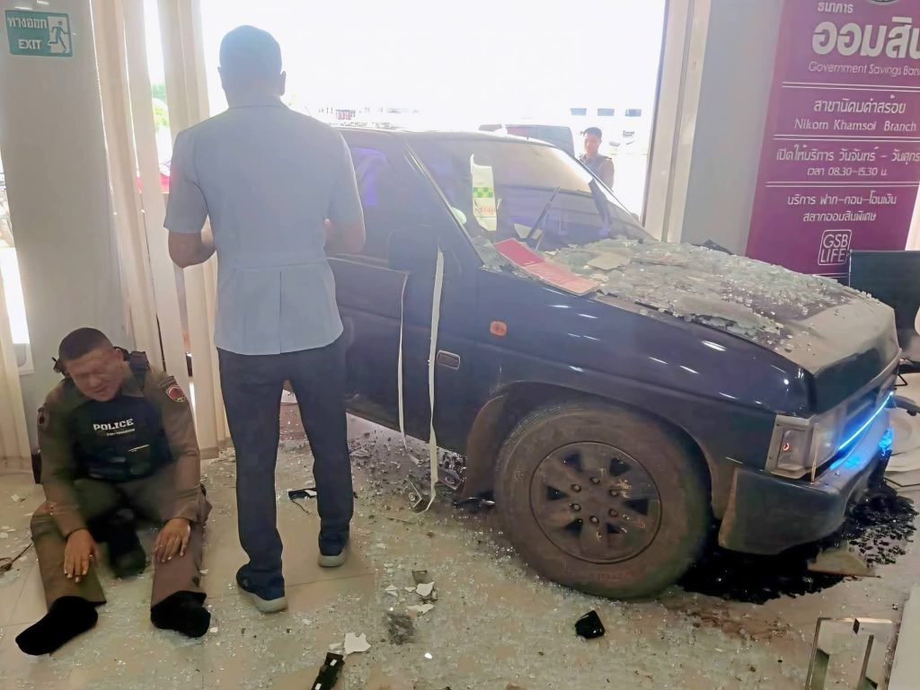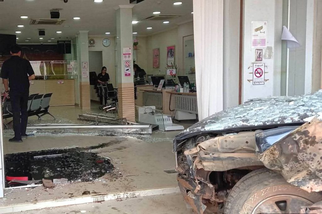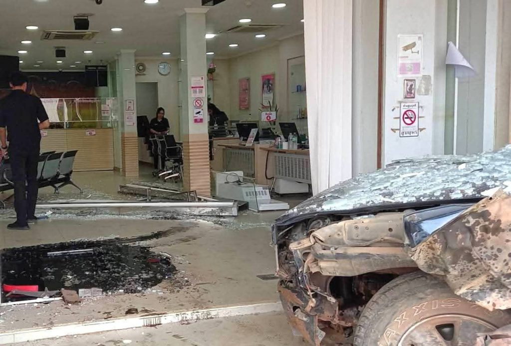 ที่เกิดเหตุพบรถยนต์กระบะสภาพด้านหน้าพังยับเยิน พุ่งทะลุกระจกด้านหน้าเข้าไปภายในธนาคาร ส่งผลให้กระจกแตกกระจายและทรัพย์สินภายในเสียหายเป็นจำนวนมาก พื้นที่โดยรอบพบเศษกระจกและชิ้นส่วนรถกระจัดกระจาย สร้างความแตกตื่นให้กับประชาชนและพนักงานที่อยู่ภายในเป็นอย่างมาก
