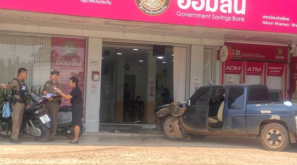 พ.ต.ต.ไพรบูรณ์ เทพนา สารวัตรป้องกันปราบปราม นำกำลังเจ้าหน้าที่ตำรวจงานจราจร เข้าตรวจสอบเหตุรถยนต์กระบะเสียหลักพุ่งชนอาคารธนาคารออมสิน สาขานิคมคำสร้อย