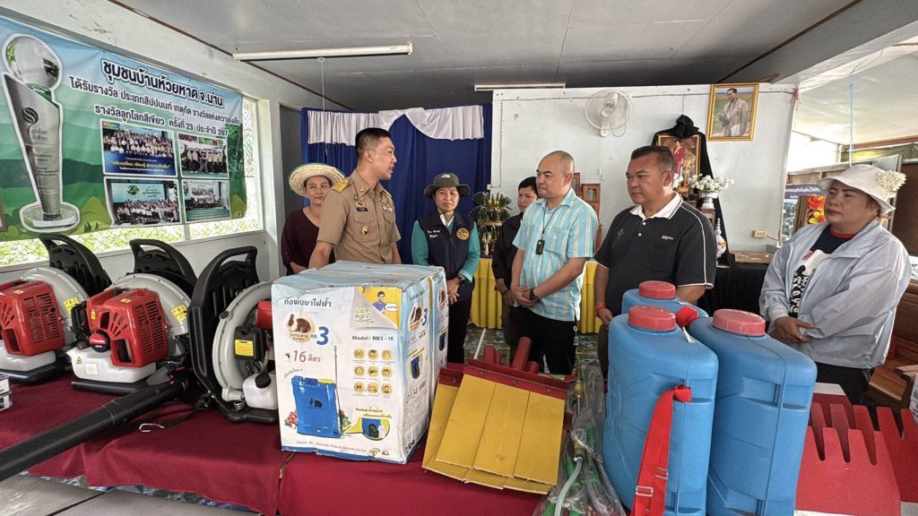 พร้อมคณะกรรมการหมู่บ้านเป็นผู้รับมอบอุปกรณ์ป้องกันและสนับสนุนการปฏิบัติงานดับไฟป่าจากห้างหุ้นส่วนจำกัด น่านเคมีภัณฑ์ เพื่อนำไปดำเนินการในภารกิจป้องกันและแก้ไขปัญหาไฟป่า หมอกควันและฝุ่นละอองขนาดเล็ก (PM 2.5) ในพื้นที่อย่างมีประสิทธิภาพ