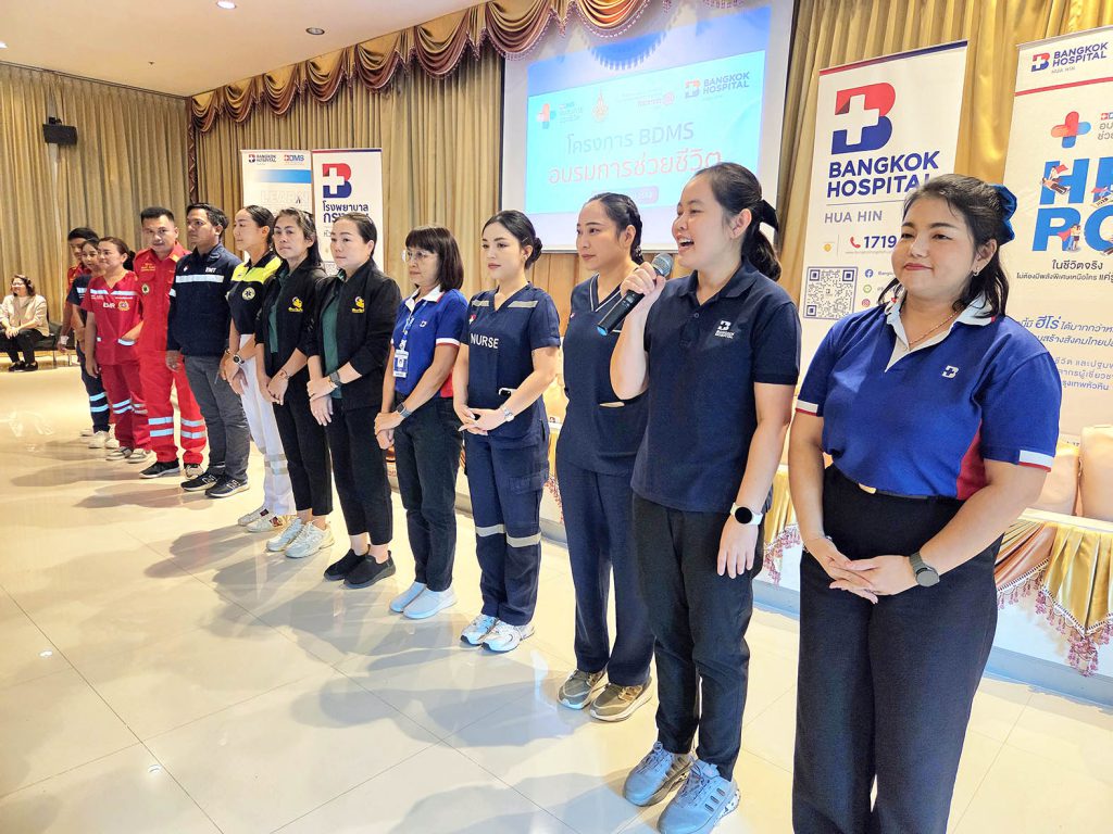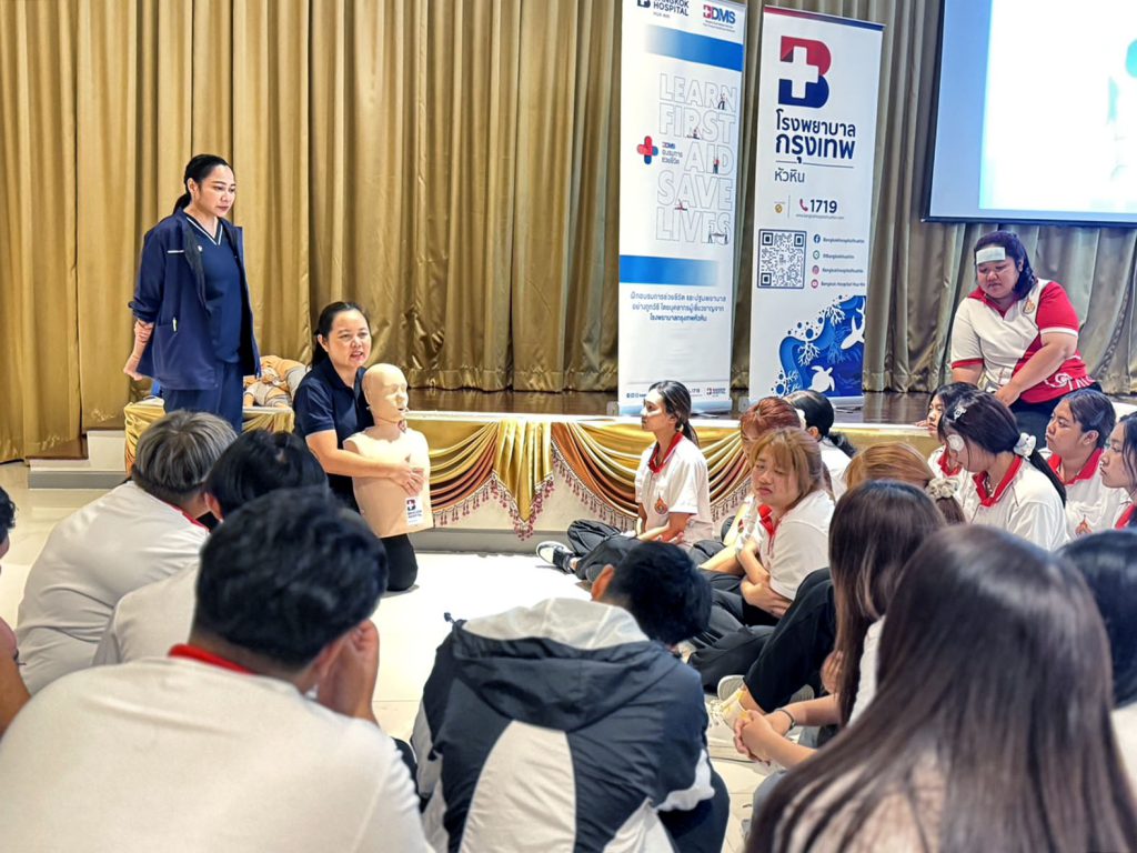 และการช่วยเหลือผู้ป่วยสำลักอุดกั้นทางเดินหายใจ โดยมีผู้เชี่ยวชาญจากโรงพยาบาลกรุงเทพหัวหิน และภาคีเครือข่าย อาทิ เทศบาลนครหัวหิน มูลนิธิสว่างหัวหินธรรมสถาน และมูลนิธิเพชรเกษมหัวหิน มาเป็นวิทยากรให้ความรู้