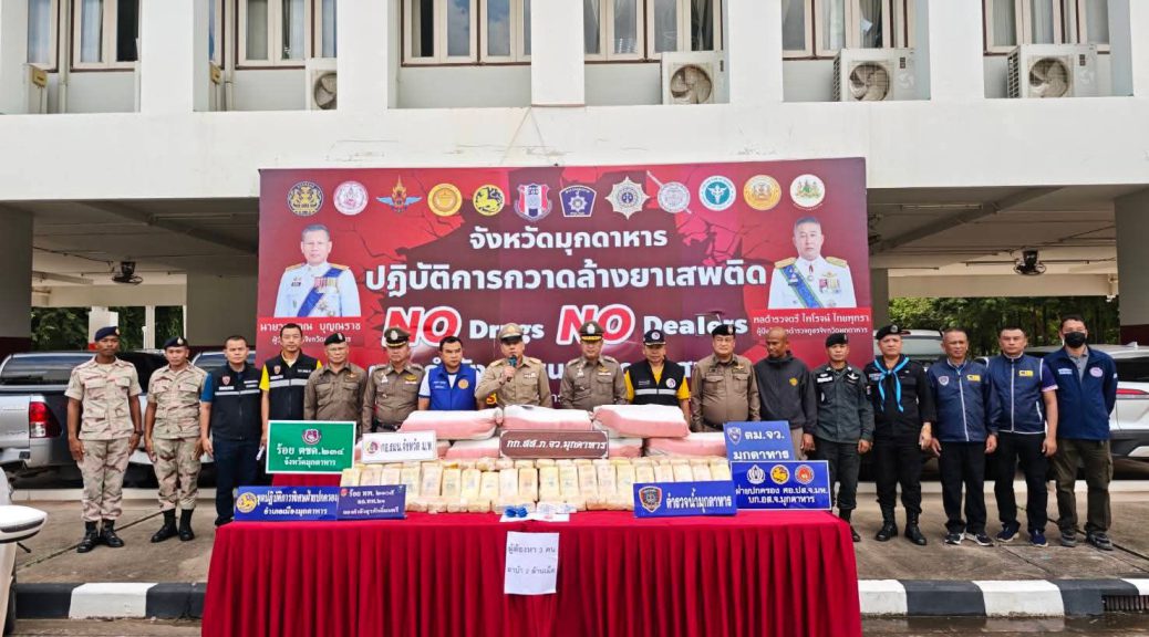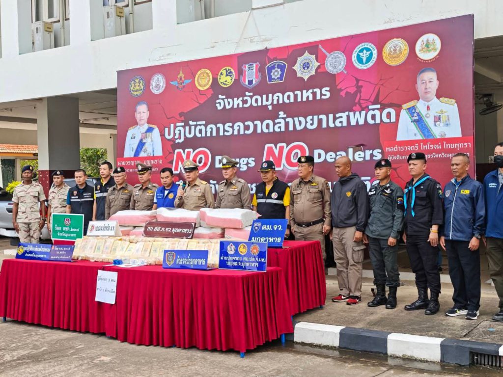 เมื่อวันที่ 25 กันยายน ที่กองบังคับการตำรวจภูธรจังหวัดมุกดาหาร นายวรญาณ บุญณราช ผู้ว่าราชการจังหวัดมุกดาหาร และพล.ต.ต.ไพโรจน์ ไทยพุทรา ผบก.ภ.จว.มุกดาหาร รวมแถลงข่าว ชุดสืบ ภ.จว.มุกดาหาร ตรวจยึดยาบ้า 2 ล้านเม็ด พร้อมจับผมผู้ต้องหาได้ 3 ราย