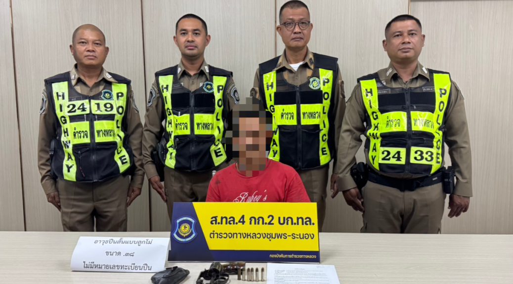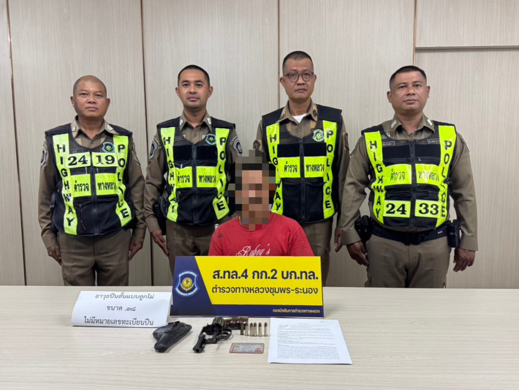 ธนากร โกศลเมธีรายงาน 0818923514 เจ้าหน้าที่ตำรวจทางหลวงชุมพร ขณะออกตรวจพื้นที่บนถนนทางหลวงหมายเลข 41 ขาล่องใต้ ช่วง กม.7-8 ต.ทุ่งคา อ.เมือง จ.ชุมพร ได้พบรถกระบะขับแซงช่องทางขวาอย่างผิดกฎหมาย จึงเรียกตรวจ จากการตรวจสอบพบอาวุธปืนพกสั้นแบบลูกโม่ ขนาด .38 ยี่ห้อสมิธแอนด์เวสสัน ความยาวลำกล้อง 3 นิ้ว