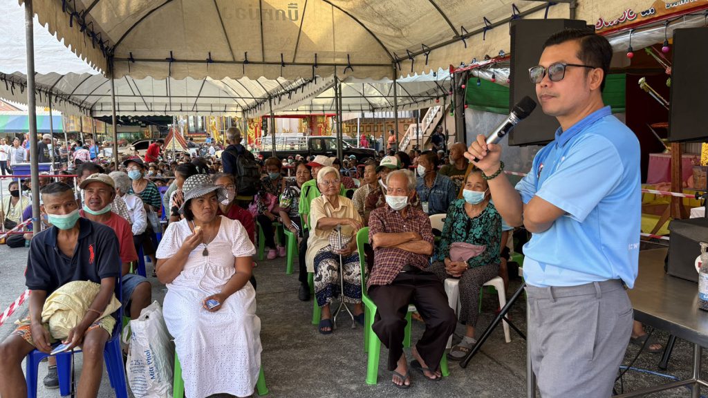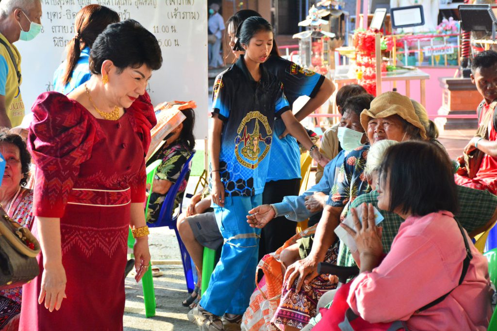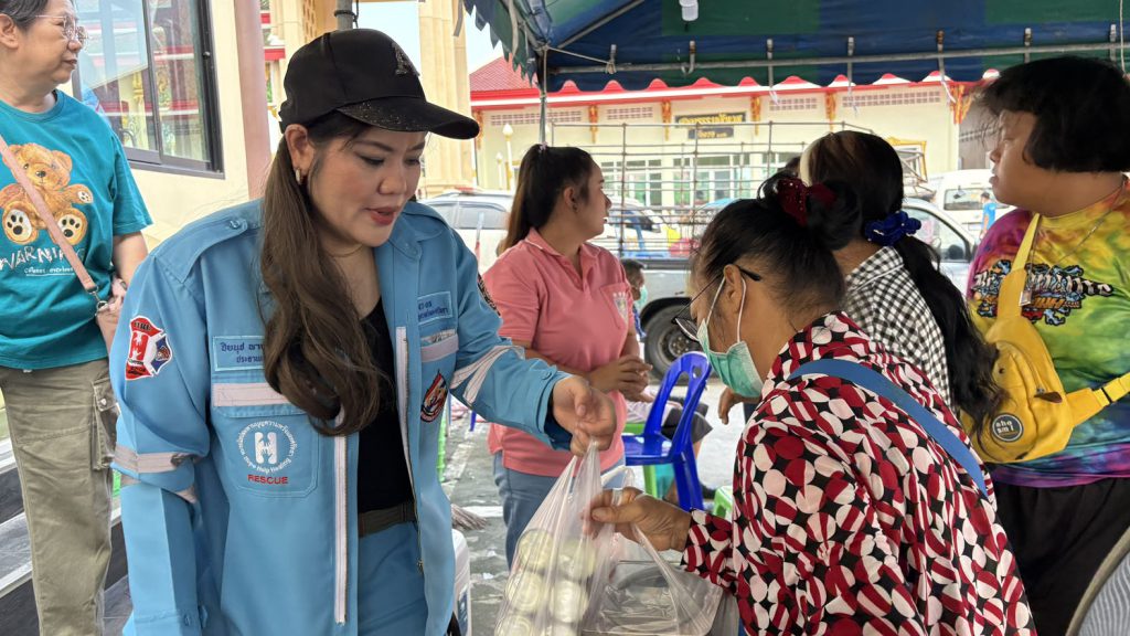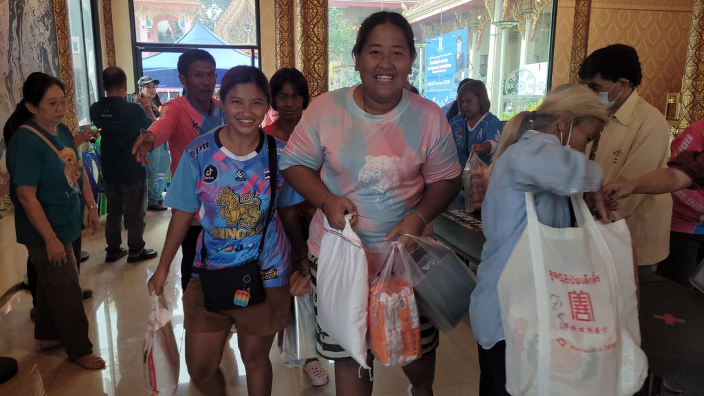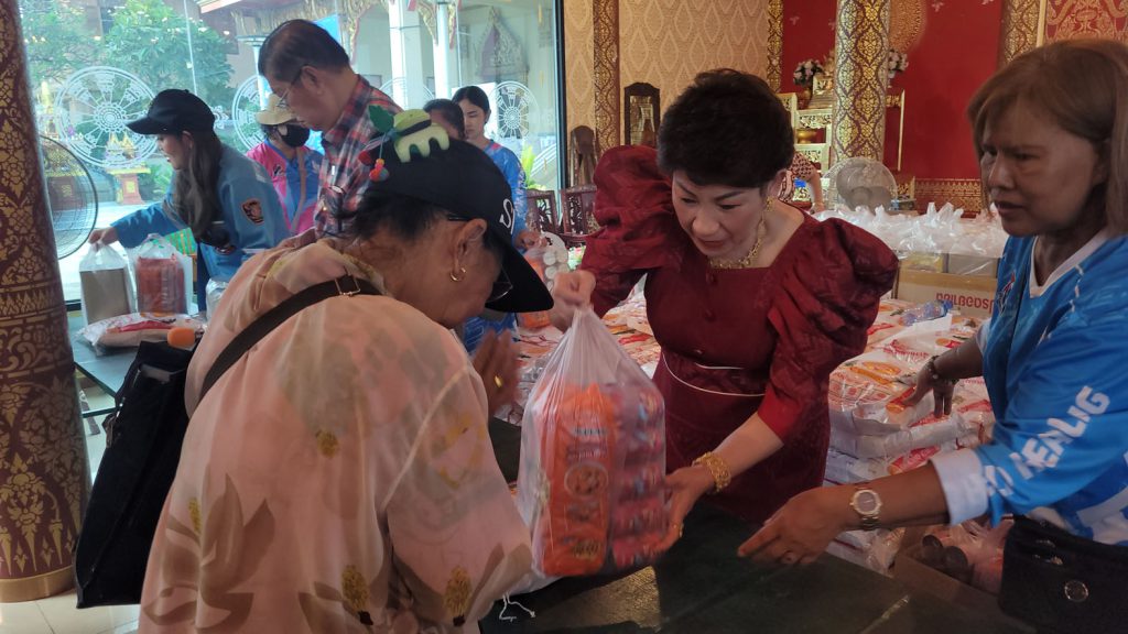 คุณแม่ธัญยธรณ์ พาณิชย์พิศาล ประธานกิตติมศักดิ์ชมรมโฮปสะพานบุญแห่งความหวังและศรัทธา คหบดีผู้ใจบุญ แจกข้าวสาร ถุงละ 5 กิโลกรัม และอาหารแห้ง